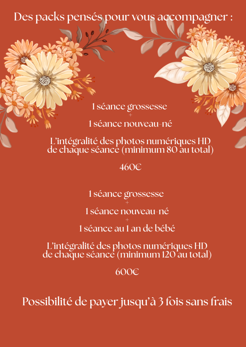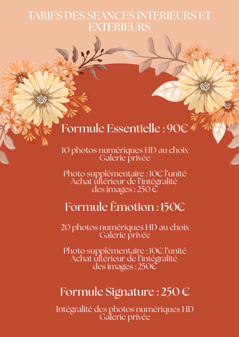 | SĂ©ances Ă domicile â style lifestyle | Pour capturer la beautĂ© de votre quotidien, dans le confort et lâauthenticitĂ© de votre cocon familial. | Pack de 10 photos Ă 90 ⏠(un supplĂ©ment peut ĂȘtre demandĂ© selon le deplacement) |